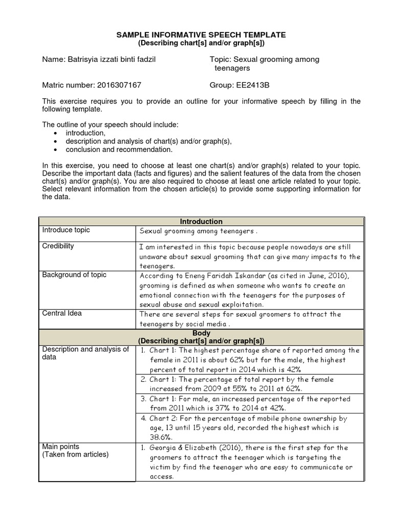 View ELC590 INFORMATIVE SPEECH TEMPLATE 030919docx from ELC 590 at Universiti Teknologi Mara. Informative Speech Outline IMPACT OF PHYSICAL. ELC590 Informative Speech Preparation Outline Speech Topic.